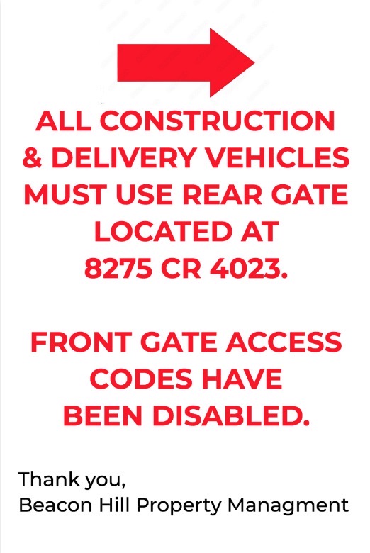 Effective this Wednesday, January 4rd, contractor and delivery access codes will be disabled at the Front Gate and only remain operational at the wider rear gate located at 8275 CR 4023.